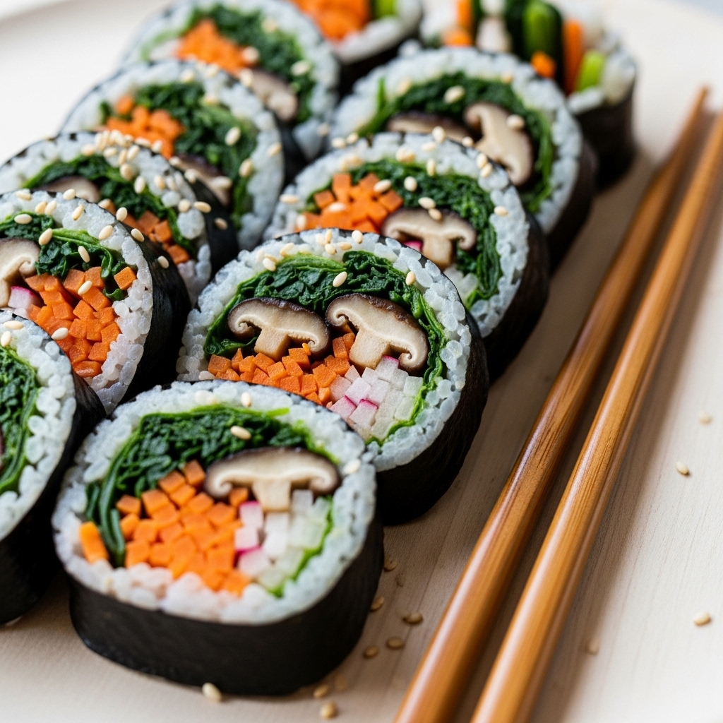 남은 나물로 만들 수 있는 가장 친숙하고 맛있는 메뉴 중 하나가 바로 김밥이죠! 고기 없이도 나물 자체의 맛과 향으로 충분히 풍성한 비건 김밥을 만들 수 있습니다.